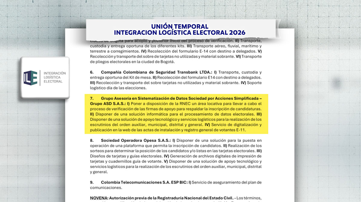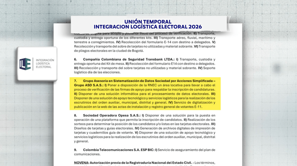 De hecho, en un documento refundido que encontró Señal Investigativa, queda claro que el Grupo ASD, dentro de la unión temporal, tiene a su cargo el suministro del software que contabilizará los votos en las elecciones de Colombia en 2026: “41 DOCUMENTO UNION TEMPORAL ok: El Grupo ASD S.A.S.: I) Poner a disposición de la Registraduría un área locativa para llevar a cabo el proceso de verificación de las firmas de apoyo para respaldar la inscripción de candidaturas. II) Disponer de una solución informática para el procesamiento de datos electorales. III) Disponer de una solución de apoyo tecnológico y servicios logísticos para la realización de los escrutinios del orden auxiliar, municipal, distrital y general. IV) Servicio de digitalización y publicación en la web de las actas de instalación y registro general de votantes E-11.