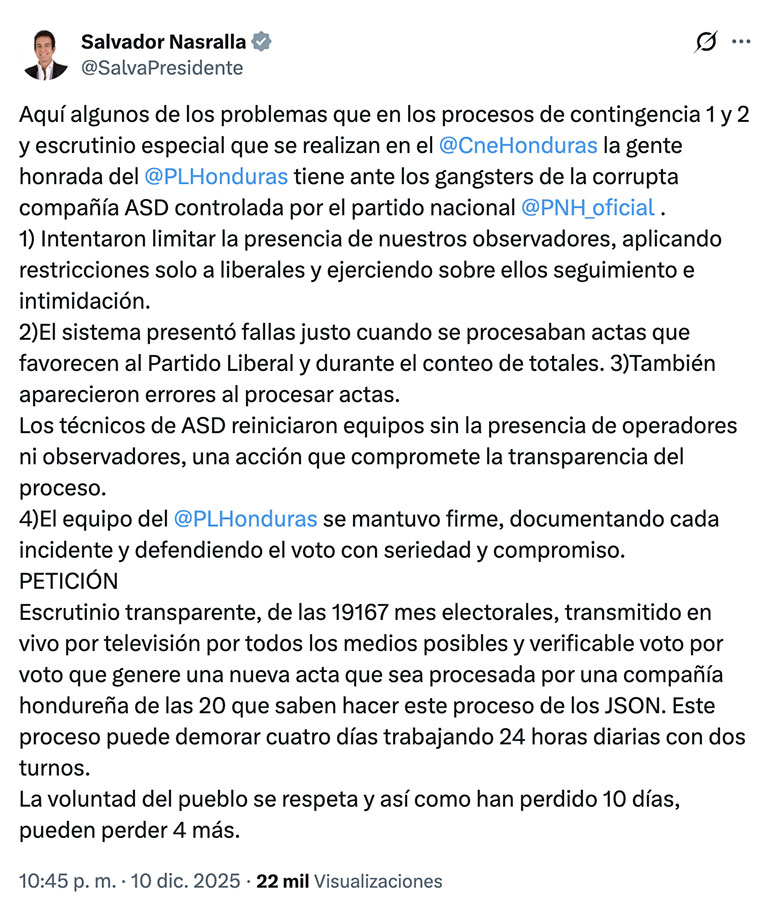 Tras las presidenciales de Honduras el pasado 30 de noviembre, Salvador Nasralla acusa a Grupo ASD —empresa colombiana contratada para operar el sistema oficial de conteo preliminar— de fallas, restricciones a observadores y reinicios del sistema electrónico sin veeduría. La divulgación de resultados tuvo apagones y demoras. En Colombia, ASD arrastra cuestionamientos por la suma errónea de votos en elecciones pasadas y tendrá la misma tarea en las de 2026.
