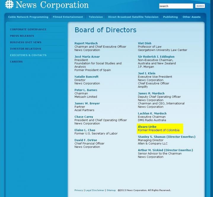 Citamos: «El ‘Gran Colombiano’ pertenece a la junta directiva de News Corporation, el segundo grupo de medios más grande del mundo y que tiene vinculación con History Channel. Sigue la polémica por la elección del exmandatario como el personaje más importante de la historia del país. El canal History tiene un convenio con la empresa Star TV, subsidiaria de News Corporation, para transmisión y cesión de estudios en la India.