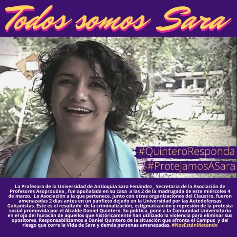 Vea, "Estoy VIVA y DOLIDA" las palabras de mi querida Sara Fernández, AMIGA, Activista Feminista, Defensora de #DDHH y Profesora de la @UdeA. Espero que las escuché @QuinteroCalle. @FCSH_UdeA @JoseGuarnizoA @GustavoBolivar @LaOrejaRoja @GNavasTalero @angelamrobledo @piedadcordoba pic.twitter.com/uevUZ1dxQt