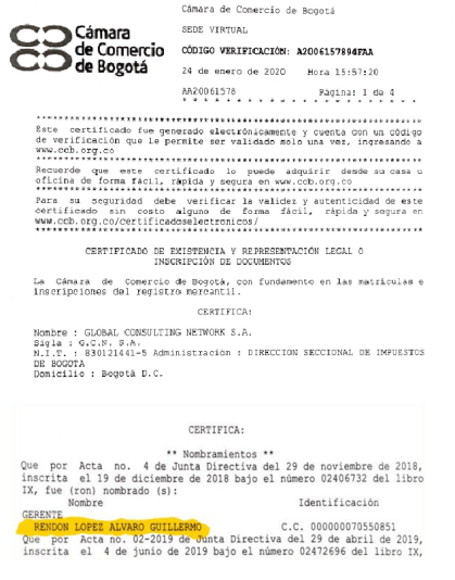impedimento ético y moral de Álvaro Guillermo Rendón López, antes del nombrarlo? Aportamos una parte del certificado de la cámara de Comercio.