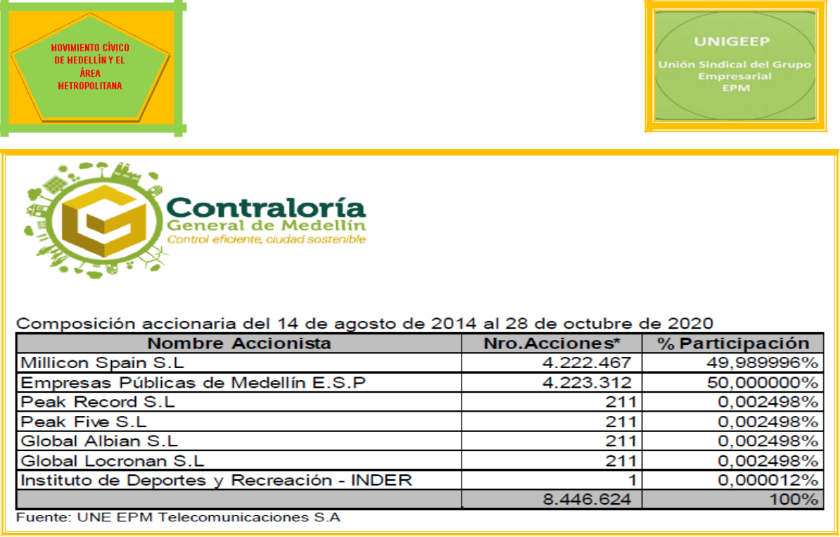 En los estados financieros que presentaron los directivos de Millicom a diciembre 31 de 2014 dicen que EPM y el INDER tienen el 50% más 1 acción y que el Grupo Millicom tiene el control administrativo y operativo. Los activos de UNE EPM Telecomunicaciones S.A. los calcularon en $ 3.253.364 y los de Millicom en 19.340.