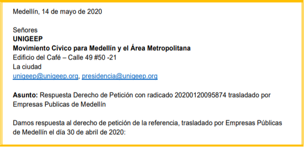 Que los ciudadanos que están saqueando el patrimonio público son unos particulares se prueba con la respuesta que el paraguayo, Marcelo Cataldo Franco le dio a un derecho de petición que le presentamos a EPM, pero que extrañamente fue remitido a este señor para que lo contestara, en violación flagrante del artículo 21 de la Ley 1755 de 2015, que habla de autoridad y funcionarios y no a particulares.
