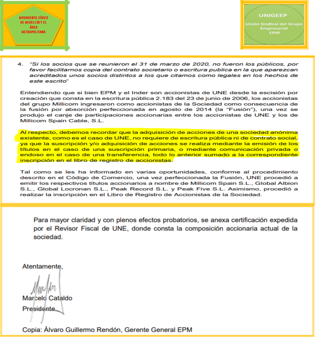 El Municipio de Medellín le cedió las acciones a EPM. El candidato para ocupar la presidencia de UNE EPM Telecomunicaciones S.A. lo presenta el Alcalde y lo elige una Junta Directiva nombrada por el Alcalde de turno. Marcelo Cataldo Franco que funge como presidente de la compañía, fue nombrado por Millicom Internacional Celular S.A. Lo que quiere decir que este particular está manejando un patrimonio público. Está afirmación está debidamente documentada.