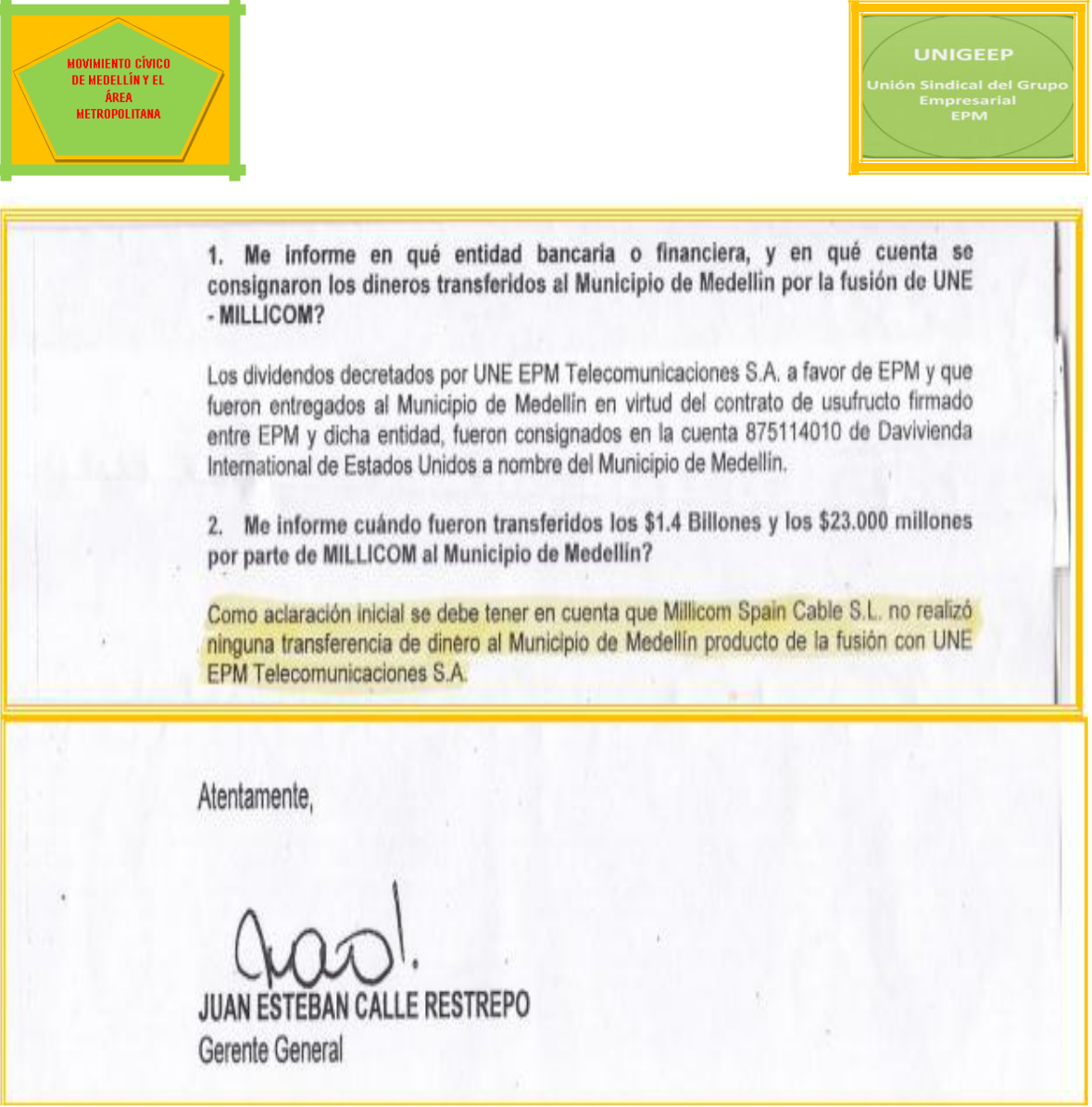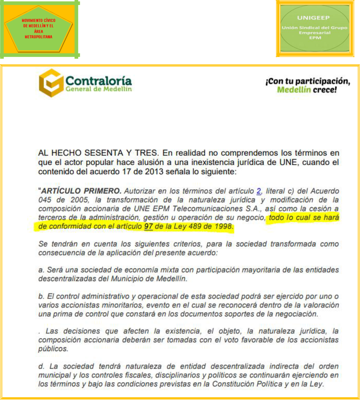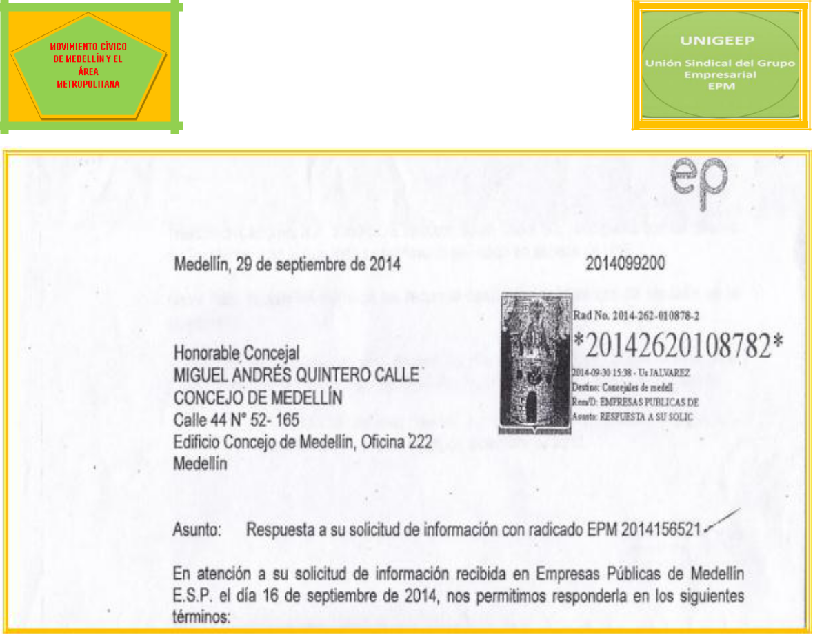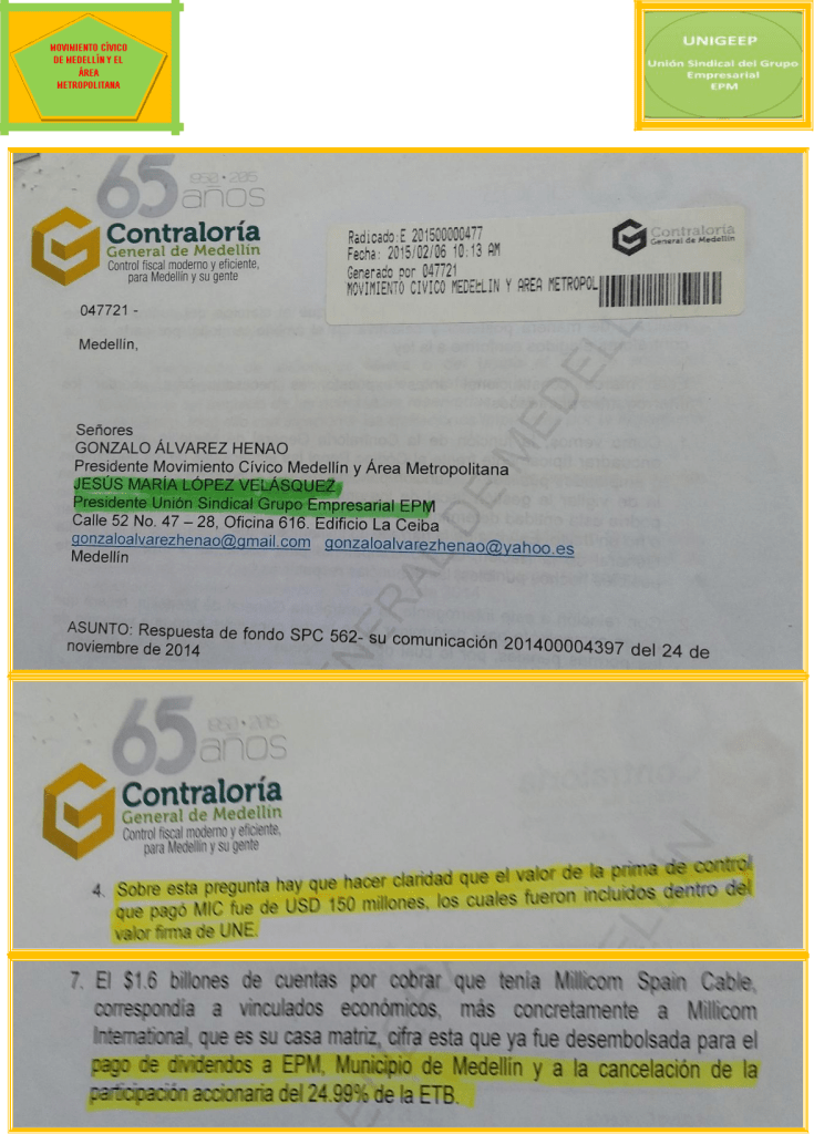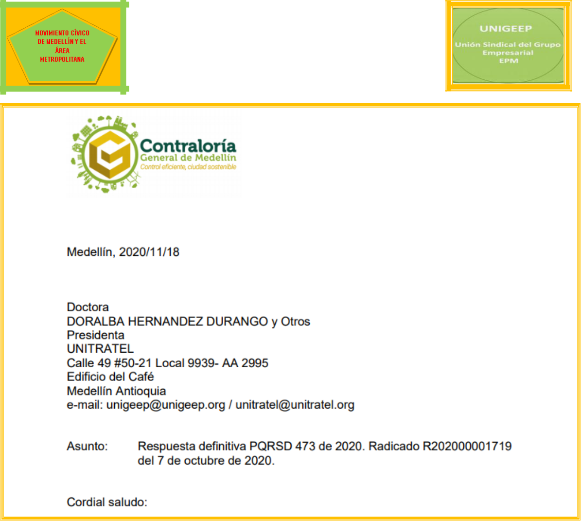 GONZALO ÁLVAREZ HENAO, colombiano mayor de edad, identificado con la cédula de ciudadanía número8.273.616, obrando en calidad de Presidente del Movimiento Cívico de Medellín Y El Área Metropolitana y JESÚS MARÍA LÓPEZ VELÁSQUEZ, colombiano mayor de edad, identificado con la cédula de ciudadaníanúmero 71.631.989, obrando en calidad de Presidente de la Unión Sindical del Grupo Empresarial UNIGEEP, atentamente nos dirigimos a Usted con el fin de dar respuesta a los cuestionamientos hechos a la acción popular por la a apoderada judicial de la Contraloría General de Medellín y para arrimar algunas de las pruebas solicitadas.