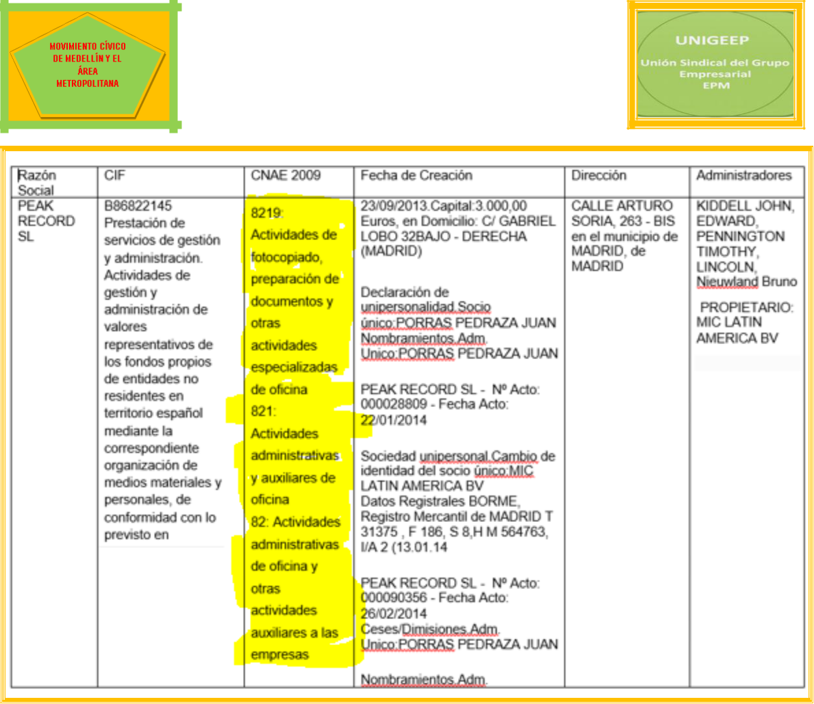 Cuando decimos que, Marcelo Cataldo Franco, José Leopoldo Gutiérrez y la colombiana, Ana Marina Jiménez Posada no tienen legitimidad, parte de un hecho cierto. Para demostrarlo, tomaremos como punto de partida los argumentos expuestos por los titulares de la Acción Popular, en cuanto afirman que la fusión por absorción fue entre UNE EPM Telecomunicaciones S.A. y Millicom Spain Cable S. L. La primera como absorbente y la segunda como absorbida; cuando hay fusión por absorción no surge una nueva empresa y la absorbente no cambia, para nada, su naturaleza jurídica.