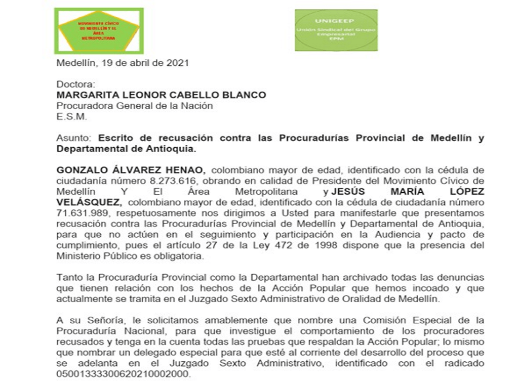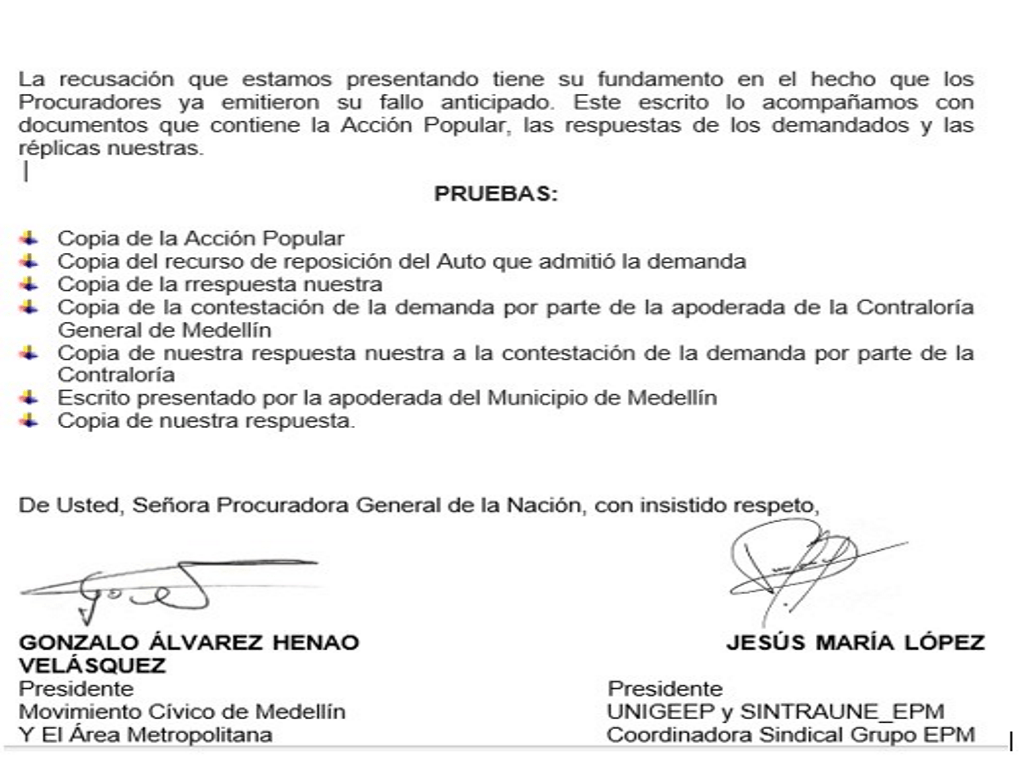 GONZALO ÁLVAREZ HENAO, colombiano mayor de edad, identificado con la cédula de ciudadanía número8.273.616, obrando en calidad de Presidente del Movimiento Cívico de Medellín Y El Área Metropolitana y JESÚS MARÍA LÓPEZ VELÁSQUEZ, colombiano mayor de edad, identificado con la cédula de ciudadaníanúmero 71.631.989, obrando en calidad de Presidente de la Unión Sindical del Grupo Empresarial UNIGEEP, de la manera más respetuosa nos dirigimos a Usted, de conformidad con lo dispuesto en el artículo 29 de la Constitución Política, con el fin de arrimar algunas pruebas que permitan despejar las dudas sembradas por la apoderada judicial de la Contraloría General de Medellín, pues reclama en su escrito la presentación de los documentos que contengan el acervo que acredita la violación de los derechos colectivos a la moralidad administrativa y al patrimonio público.