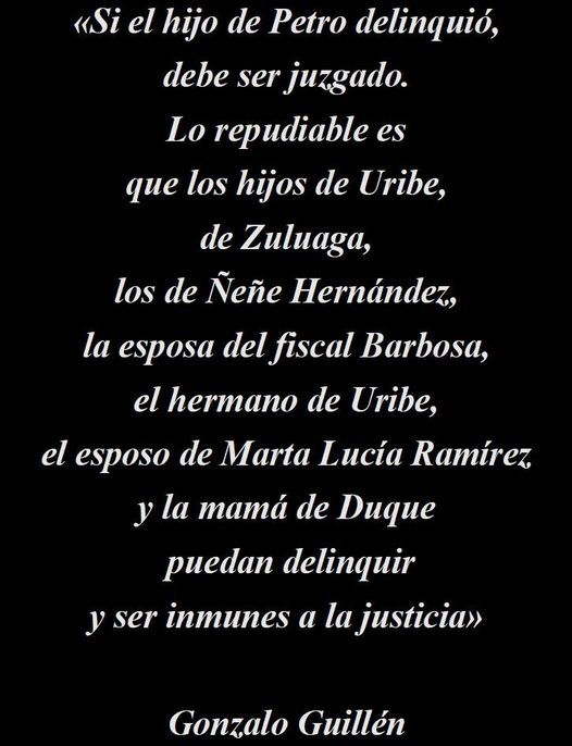 «Vale anotar que los hijos de Uribe, los de Ñeñe Hernández, el de Zuluaga, el de Fabio Echeverry, la esposa de Barbosa, E.T.C., delinquen con impunidad plena y garantizada» (Gonzalo Guillén)