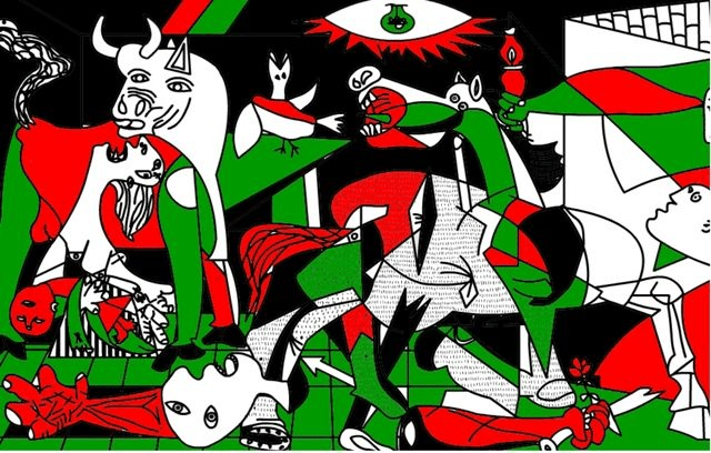 «Guernica es y será el resumen y el grito del dolor, el horror, el oprobio, la impotencia, el desgarro profundo del alma que sentimos ante el genocidio y la masacre que se repite sin cesar contra los débiles y desamparados de esta tierra. Las fuerzas más oscuras de nuestra naturaleza se han vuelto cotidianas y hasta dignas de alabanza; su propaganda victoriosa se ha vuelto una cultura. Guernica es el mazazo que le da directo a la poca o mucha conciencia que nos queda. Hoy lloro por Palestina. PARA LOS CANALLAS NADA»