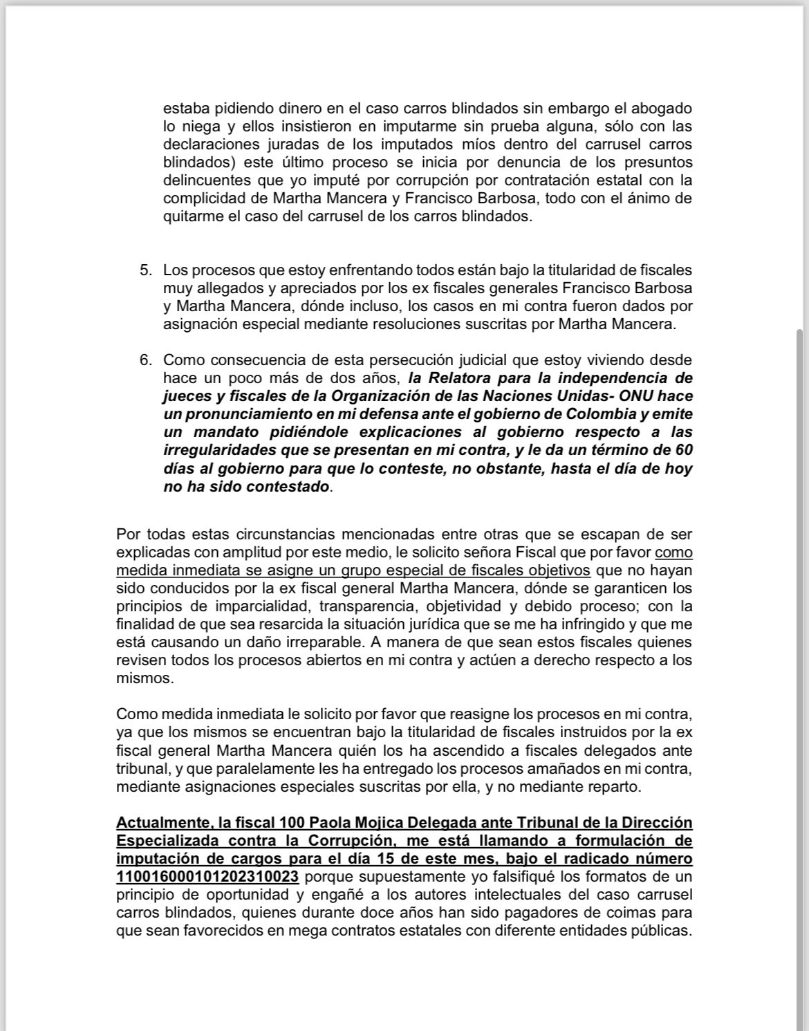 Esto también se evidenció con el caso del carrusel de carros blindados, por el cual, como ejemplo de una persecución judicial que fue denunciada hasta por la Relatora Especial de la ONU para la independencia de Jueces y Fiscales @SRjudgeslawyers mediante un mandato que aún, inexplicablemente no ha sido respondido por el gobierno colombiano, donde me abrieron procesos penales y disciplinarios con delitos y faltas inexistentes.