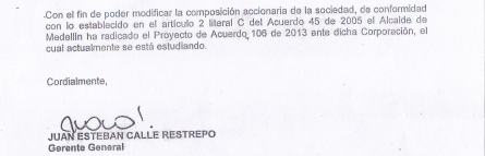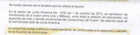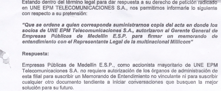 A Juan Esteban Calle Restrepo, Gerente General de EPM le presentamos un derecho de petición, solicitando copia del acta de junta directiva de UNE EPM TELECOMUNICACIONES S.A., en la que constara que había sido autorizado para adelantar la negociación con Millicom, Esta fue la respuesta: