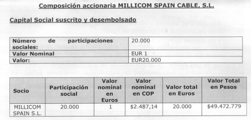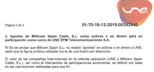Millicom Spain Cable S.L. fue creada por Millicom Internacional Celular S.A., como una empresa unipersonal; pero el Doctor Jorge Londoño de la Cuesta, actual Gerente General de EPM, empeñado como está, en cubrirle la espalda los defraudadores de Millicom, en respuesta a un derecho de petición que tiene fecha de 15 de febrero de 2016, dijo: “Para establecer la relación de intercambio de la fusión se valoraron por parte de la banca de inversión UNE y sus filiales incluyendo la inversión en Colombia Móvil y de otro lado a Millicom  Spain Cable S.L., los accionistas de la sociedad absorbida  (Millicom Spain Cable), recibieron 4.223.311 acciones ordinarias de la sociedad absorbente (UNE), las cuales representan la participación que ya tenían en la sociedad absorbida antes de la fusión (inversión en otras sociedades, caja). ¿Si Millicom Spain Cable S.L. era una empresa unipersonal, de donde apareció con socios? Aquí está la prueba de que la empresa de papel era unipersonal: