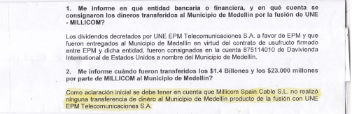 Juan esteban Calle Restrepo, Gerente General de EPM, en respuesta a un derecho de petición que le presentara el concejal para la época, Miguel Quintero Calle que tiene fecha de 29 de septiembre 2014, un mes después de la supuesta fusión, indagó por los 1.4 billones que Millicom según los funcionarios municipales, y compañeros del Concejo de Medellín, la multinacional se había comprometido a entregar para inversión social en Medellín. Esto fue lo que dijo: (…)