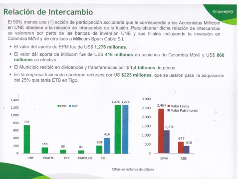 Cuarenta y nueve millones de pesos colombianos (COP $ 49.000.000), comparado el patrimonio que reportó UNE EPM TELECOMUNICACIONES S.A. el 14 de julio de 2014, un mes antes de la supuesta fusión y que Millicom, según consta en el papel entregara los 49 millones de pesos.
