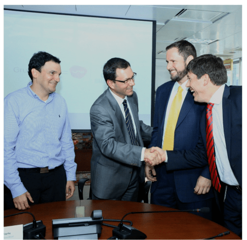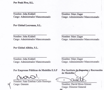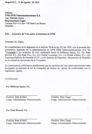 Ese mismo 14 de Agosto de 2014, Juan Esteban calle Restrepo Gerente de EPM, le escribe a su cómplice, al parecer desde Bogotá, Esteban Cristian Iriarte, para darle a conocer el acuerdo de voto entre accionistas, EPM, el INDER, Millicom Spain S.L., Peak Recorrd S.L.,  PEAK FIVE S.L., GLOBAL ALBION S.L., GLOBAL LOCRONAN S.L. El documento  está firmado solamente por Juan Esteba Calle por EPM y David Mora Gómez por el INDER. Lo que resulta llamativo es que el documento no se encuentra firmado por las personas que aparecen como administradoras de las 5 empresas de papel que figuran como socias de UNE EPM TELECOMUNICACIONES S.A. La escritura de fusión sin autorización lega fue firmada  el día 14 de agosto de 2014. Aquí aportamos la prueba.