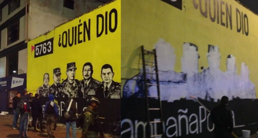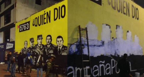 «Ejército censura mural de falsos positivos, será que les duele la verdad, o será que es malo un mural con la verdad, pero para ellos no es malo matar civiles para hacerlos pasar por guerrilleros y decir que estaban ganando la guerra. ¿Quién dio la orden☠?».✊🇨🇴🕊 #CampañaPorLaVerdad#Colombia#Censura